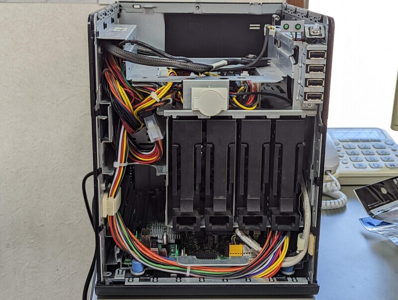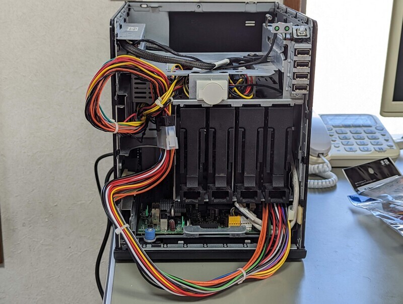 中継コネクタは電源部右側に寄せておき、ATX電源ケーブル側の余ったケーブルは5インチベイ左側のケーブルトンネルに押し込んだ。これでエアフローも確保できるし、前面扉の開閉にも干渉せずにケーブリング出来た。