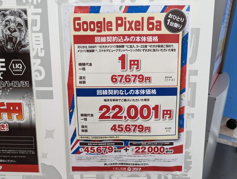 ソフマップで先日見かけたSoftBank版Pixel 6a回線契約なし一括22,001円があったのでハナシを聞いてみる。とりあえず、最悪メイン回線をpovo2.0に移行するつもりなので、サブ回線で使ってるpovo2.0はMNPしてもいいかなってことで料金プランを色々提示してもらう。